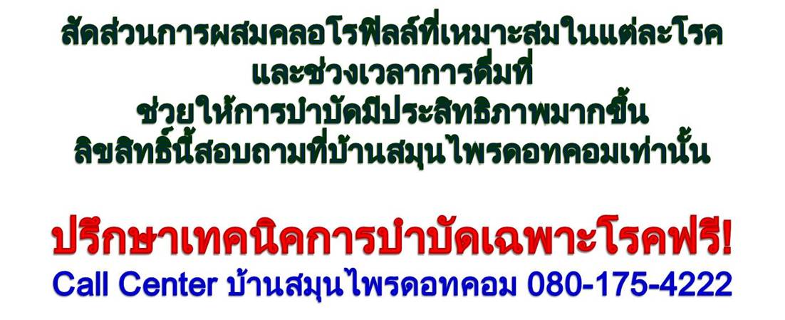 2.ช่วงบำบัดรักษา 7-15 วัน ผสมคลอโรฟิลล์ 5 ซีซี/น้ำสะอาด 1.5 ลิตร+ 5 ซีซี/น้ำ 1 แก้ว เช้าและก่อนนอน